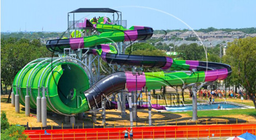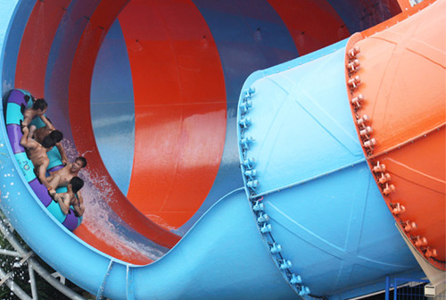 巨蟒滑梯:游客乘著最多一次可以容納6個人的圓形皮筏浮墊從19米的高空出發(fā),高速穿越一段六十多米的螺旋滑槽后,急速下降近十米俯沖至一條巨大封閉管道中,反復(fù)左沖右突和旋轉(zhuǎn)著,猶如身處憤怒的蟒蛇當(dāng)中,努力去黑暗作斗爭,最終重見光明,回歸平靜的水中。帶給游客一種獨(dú)特的奮進(jìn)的漂流體驗(yàn)。由于體積龐大,形狀獨(dú)特壯觀可以作為大型水上樂園王牌賣點(diǎn),標(biāo)志性設(shè)施。另外此水滑梯接待能力非常強(qiáng)每小時最大接客量高達(dá)1080人,最大程度地縮短游客排隊(duì)時間,極大的吸引人氣。